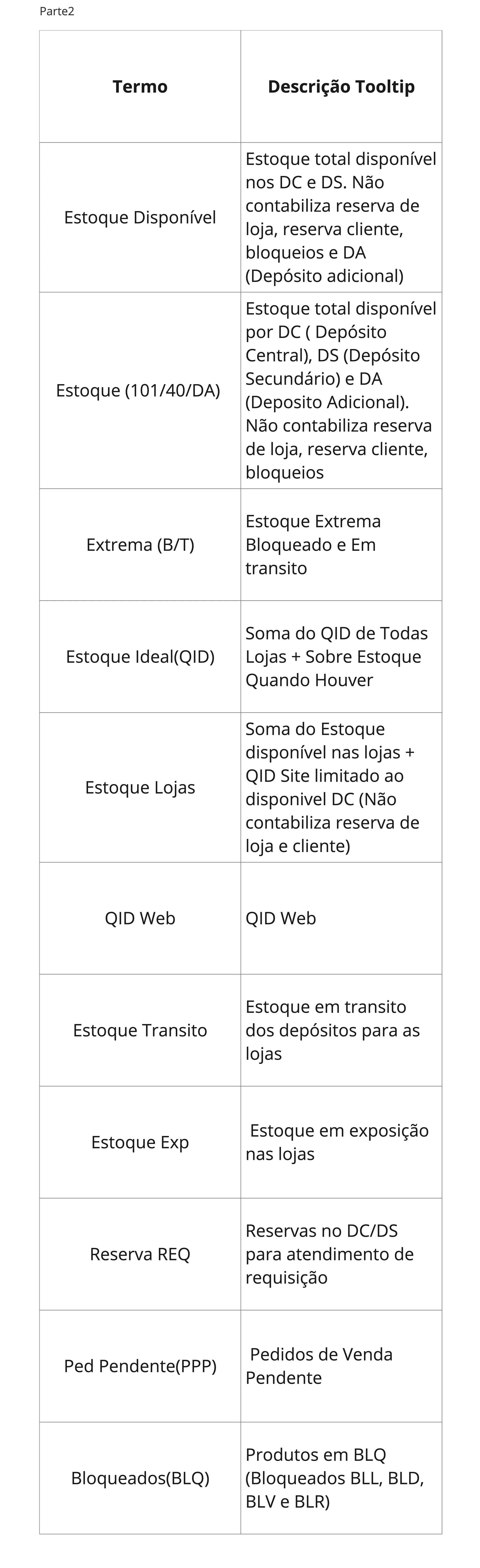 Neste cenário, um dos pontos analisados foi a descrição dos tipos de estoque presente na página de compras, na qual os analistas fazem a análise do sortimento da companhia. Nesta tela, são apresentados 11 siglas referentes aos estoque da companhia, e cada um dos campos contém um tooltip de apoio apresentando o significado daquele dado.