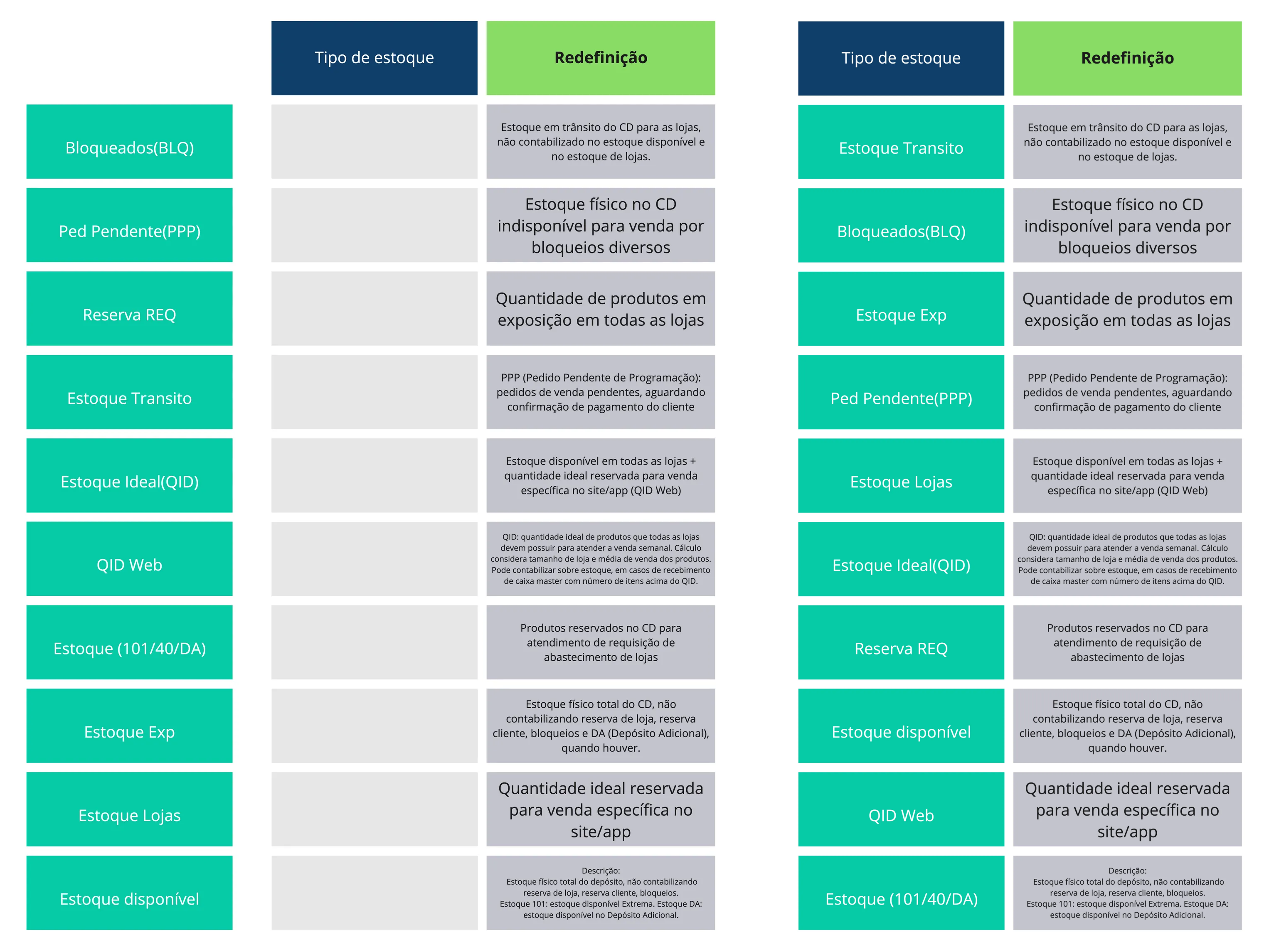 Com esta informação, o próximo passo foi conversar com os analistas de compras para verificar se eles possuíam um entendimento correto sobre cada tipo de estoque que era apresentado. Para isso, utilizamos uma dinâmica individual, na qual apresentávamos o nome do dado, por exemplo, *estoque disponível,* e solicitava-mos que nos explicassem seu significado, deixando claro que o objetivo não era avaliá-los e que, caso não soubessem o significado de algo, não haveria nenhum problema. O processo se repetiu até que todos os títulos fossem analisados.
